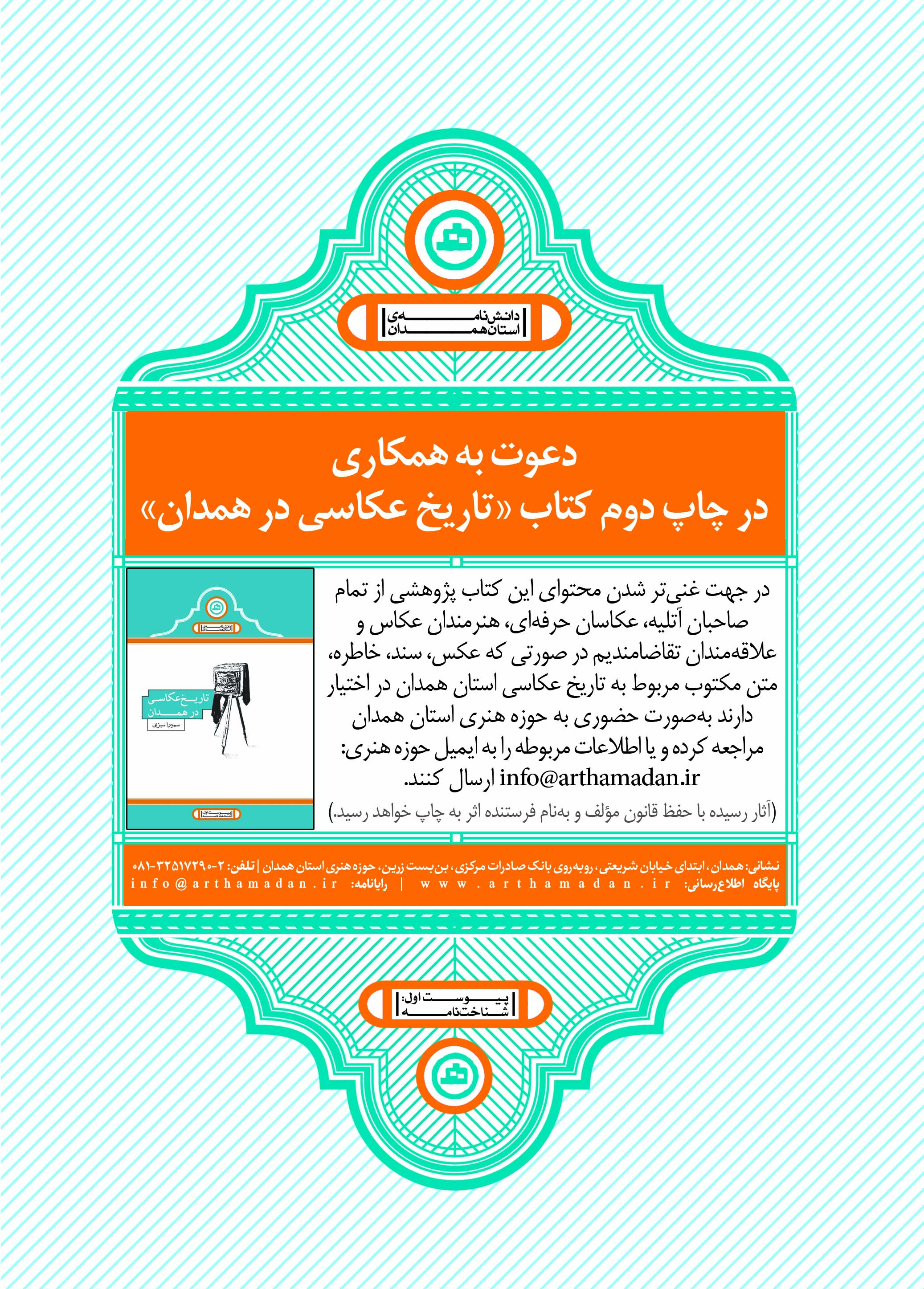 مسوول روابط عمومی حوزه هنری استان همدان روش گردآوری این کتاب را کتابخانهای و شفاهی بیان کرد و افزود: مکتوبات دانشنامه همدان در هر دوره پس از غنیتر شدن به چاپ مجدد می رسد، از این رو از تمام صاحبان آتلیه، عکاسان حرفه ای، هنرمندان عکاس، و علاقمندان تقاضامندیم در صورتی که عکس، سند، خاطره، متن مکتوب مربوط به تاریخ عکاسی استان همدان در اختیار دارند به صورت حضوری و یا اطلاعات مربوطه را به ایمیل حوزه هنری استان همدان به آدرس info@arthamadan.ir ارسال کنند.