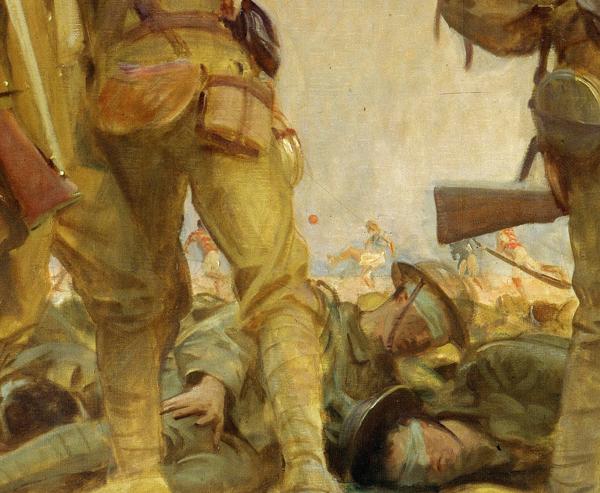 اما در تابلوی سارجنت درد و رنج بزرگ‌تری پنهان است. درد و زخمی که نقاش آن را پنهان کرده. شاید موضوع اصلی تابلوی سارجنت همین زخم پنهان است: به آن سربازان نگاه کنید همان‌ها که در عمق تابلو بی‌تفاوت به فاجعه سرگرم بازی هستند. سارجنت آنها را در سایه برده تا نشان دهد آنچه خشونت جنگ است نه این فیگورهای بر زمین غلطیده و آن چشمان از دست رفته که «فراموشی» است. آنچه جنگ را بازتولید می‌کند فراموشی است . عبور زمان و عادت است. در تابلوی سارجنت خشونت و رنج واقعی همین کنار آمدن با رنج است.