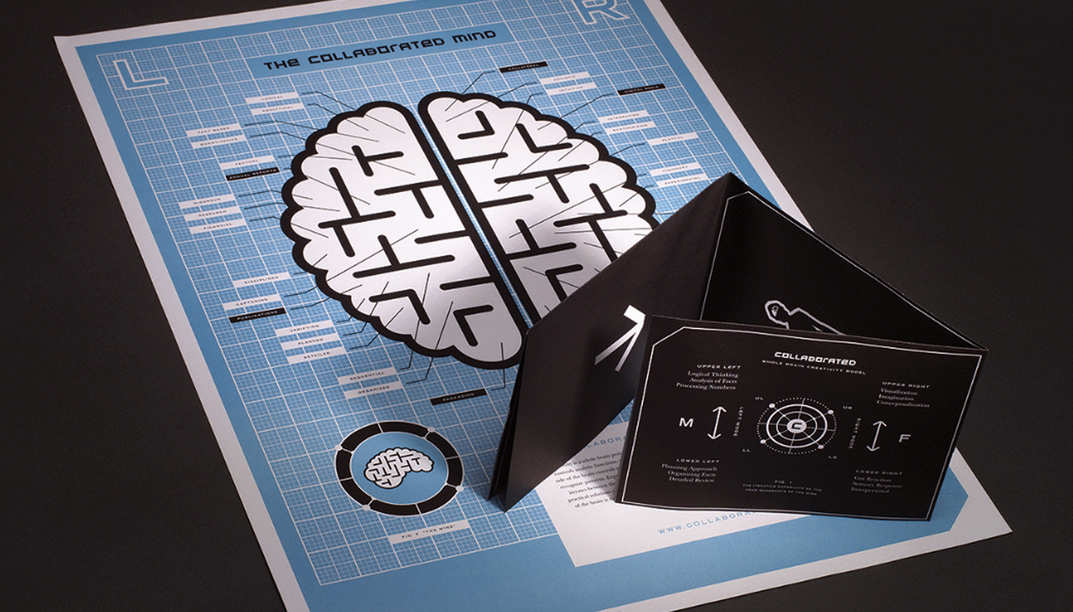 ایده ی مشترک یک قطعه ی تبلیغاتی ابداعی است که به صورت های مختلفی ارائه شده است. یکی از آن ها بروشوری است که به صورت پوسترارائه می شود و توسط "جیمز اولاک" طراحی شده است. طرح این کار بیننده را جذب می کند. و به دلیل محتوای آشکارو تاثیرات بصری آن، به عنوان یک اثر تبلیغاتی برگزیده مورد توجه قرار می گیرد. اولاک شرح می دهد که در پی آن است تا به عنوان متفکری جدی، مطابق روز و شرایط حاضر عمل کند. او در طراحی اثرش از استعاره استفاده می کند. یکی از این کاربردها، نیمکره های راست و چپ مغز است که دربطن اثر از آن استفاده کرده و با این کار بینش و پردازش تفکر را در اثر ایجاد می کند. فضای تبلیغاتی فکر مشترک، یک نمایش هندسی است که به طور بصری رابطه ی میان هنر و علم را انعکاس می دهد. این کارها از دروس رشته ی پزشکی الهام گرفته شده است.