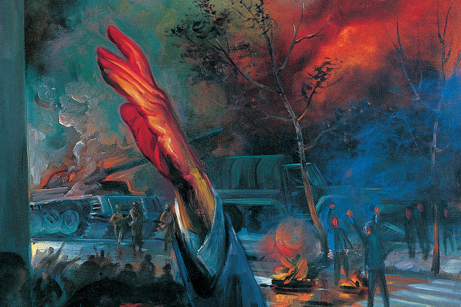 فضا غرق در آتش و خون است. در فضاهای پشت و زمینه‌ای اثر، صفحه‌ای مبهم از تانک و ابزار جنگی نمایان گشته است که عده‌ای در مقابل این تهاجم نظامی ایستادگی می‌کنند.