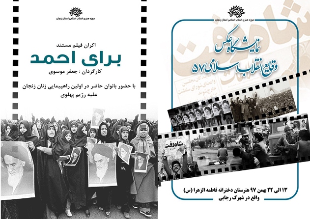 لازم به یادآوری است، نمایشگاه عکس وقایع انقلاب 57 و اکران فیلم مستند «برای احمد» از سیزدهم لغایت بیست و دوم بهمن ماه 97 برای دانش‌آموزان هنرستان فاطمه الزهرا به نمایش گذاشته خواهد شد.