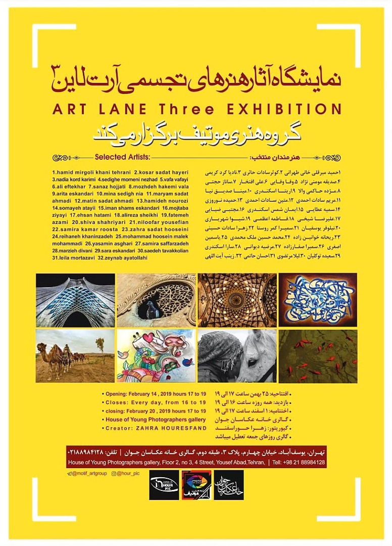 نمایشگاه گروهی آثار هنرهای تجسمی گروه هنری «موتیف» روز پنج شنبه ۲۵ بهمن 97 از ساعت ۱۷ تا ۱۹ برگزار میشود و تا ۱ اسفند ماه بغیر از جمعه از ساعت ۱۷ الی ۱۹ پذیرای علاقمندان است.